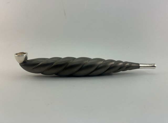 この形は、神殿前の注連縄、横綱の土俵入りでお馴染みの化粧回しがモチーフ。古くからある煙管の定番。煙管内部で煙が遊び、冷やす効果がある。雁首と吸い口は銀鍍金、胴は四分一仕上げ。 全長:約180mm 最大径:約21mm 重量:約65g