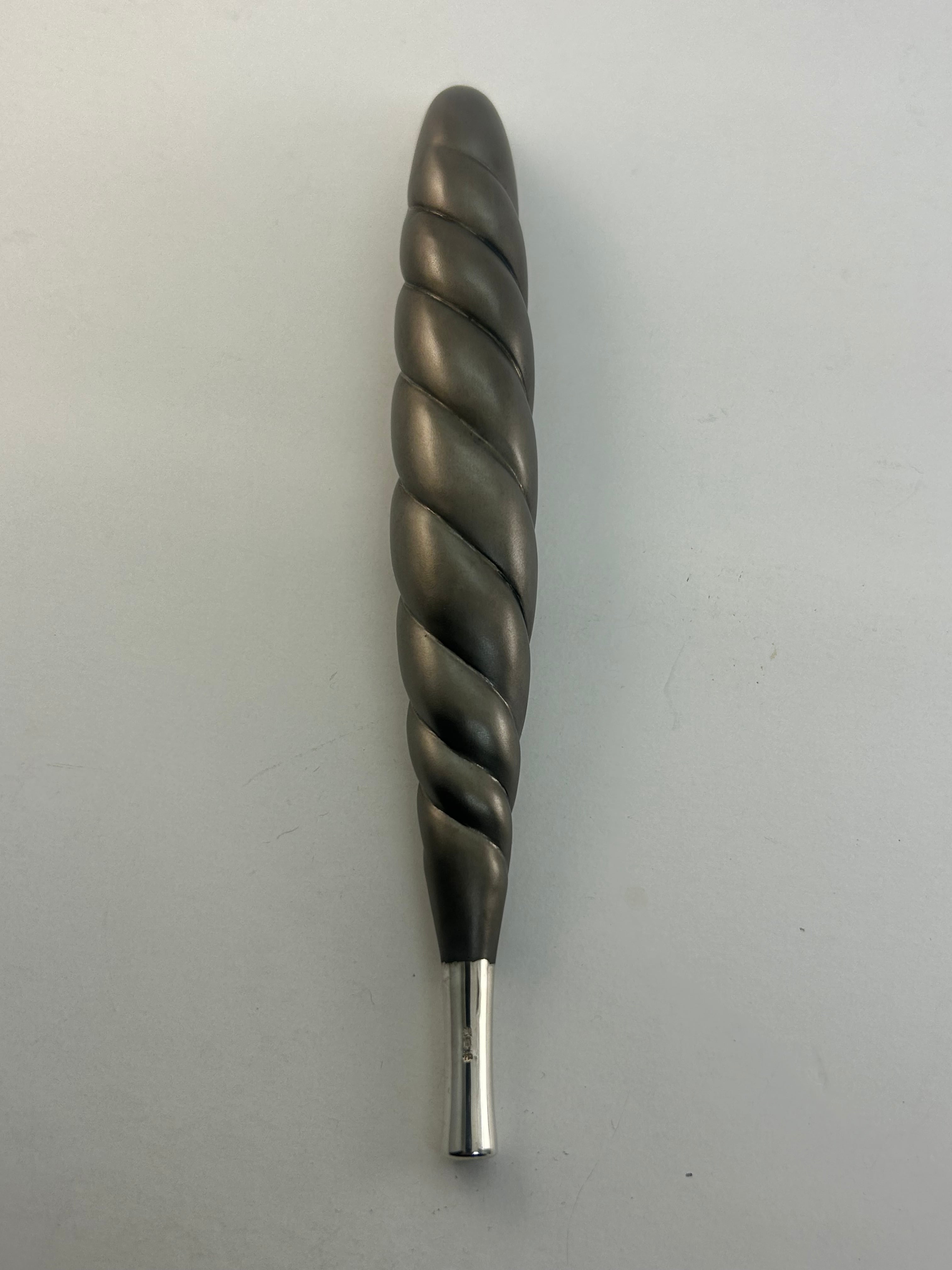この形は、神殿前の注連縄、横綱の土俵入りでお馴染みの化粧回しがモチーフ。古くからある煙管の定番。煙管内部で煙が遊び、冷やす効果がある。雁首と吸い口は銀鍍金、胴は四分一仕上げ。