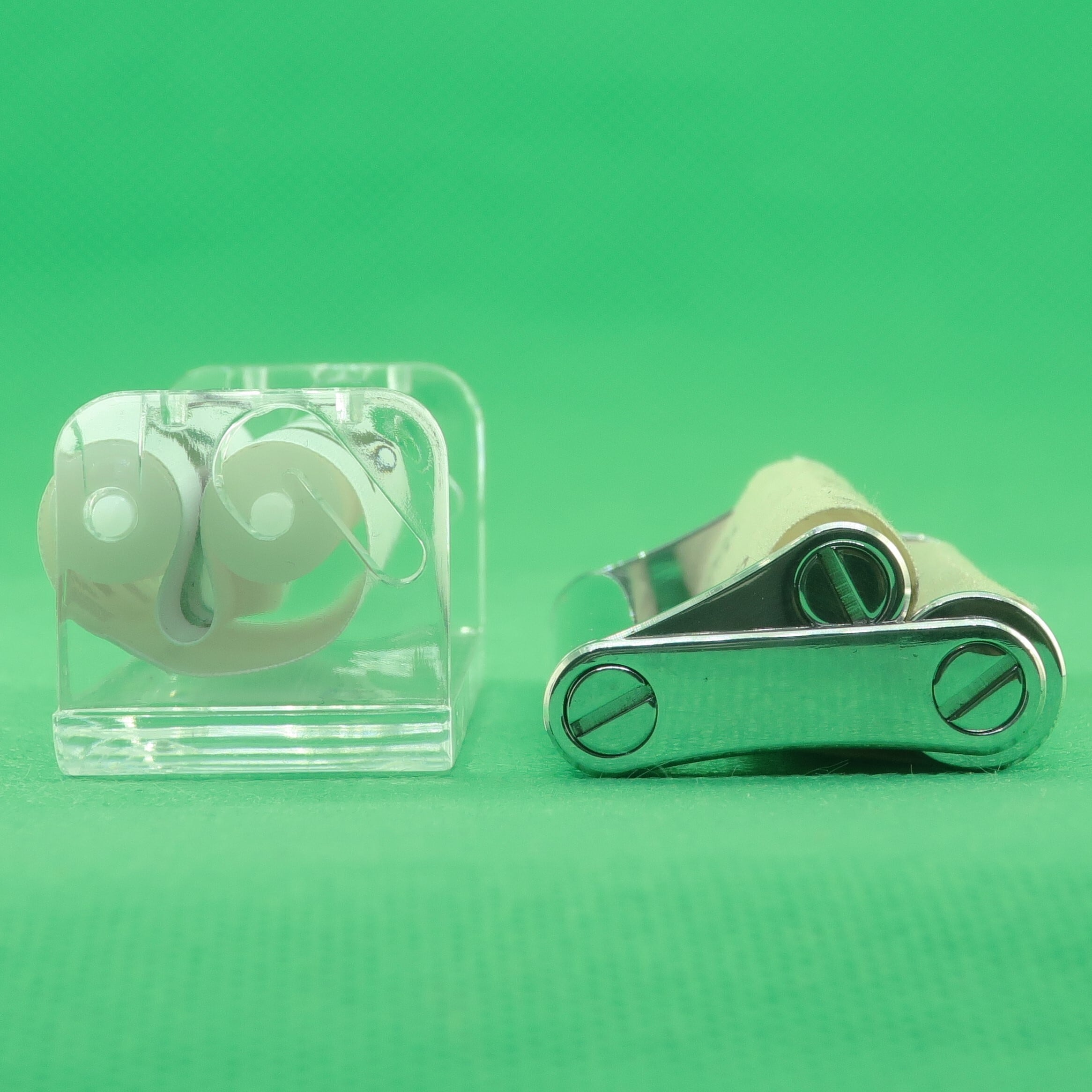 マツ・ハンドローラーは、恐らくは手巻きたばこ用のローラーの中でも最も高価なものであるといえるでしょう。ジュラルミンの削り出しパーツと布製ベルトで、独自のフォールディングシステムを採用したローラーは、折り畳み時の厚みがわずか16㎜で、持ち運びの時、嵩張らない優れもの。巻紙は幅70㎜までのレギュラーとスリムサイズに対応しています。金属製のローラーは滑らかに巻き上げることができるので、巻紙作業がスムーズで簡単に行えます。ひとつの道具を長きに渡って愛用してほしい、そんな想いが詰まったローラーです。